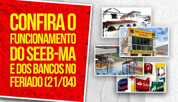 O SEEB-MA informa que as sedes administrativas do Sindicato – em São Luís (Rua do Sol, Centro) e em Imperatriz (Rua Maranhão, Centro) – não funcionarão no dia 21 de abril, devido ao feriado de Tiradentes.Durante esse dia, as agências bancárias também estarão fechadas. O atendimento ao público será n